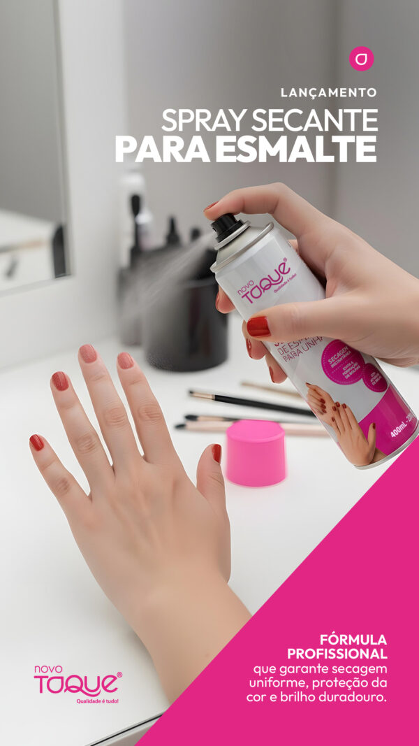 O Spray Secante foi desenvolvido para proporcionar secagem rápida e uniforme do esmalte, evitando a formação de bolhas e marcas indesejadas. Sua fórmula inovadora cria uma película protetora que acelera o processo de secagem, preservando o acabamento e a durabilidade da esmaltação.